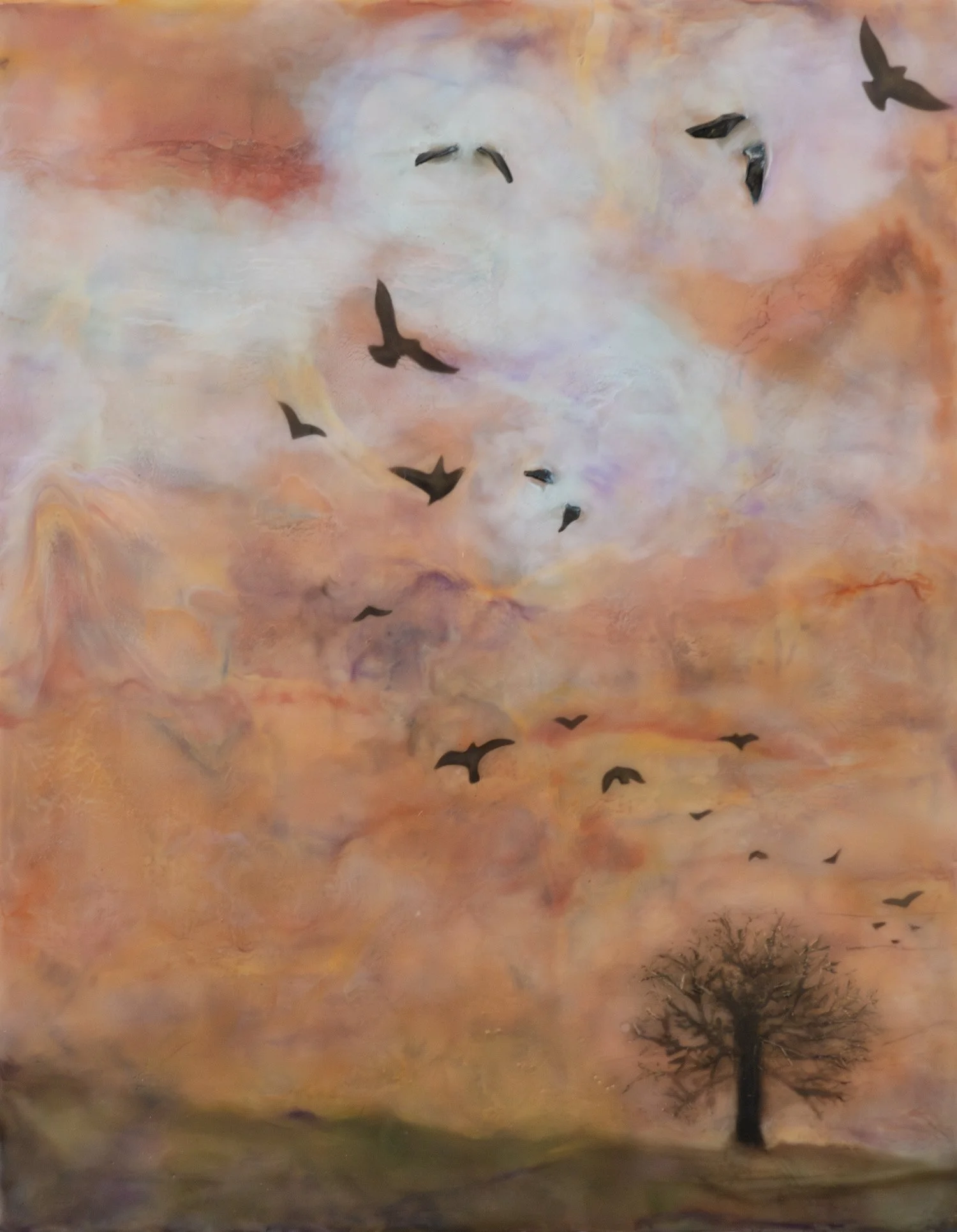 The painting moves with a quiet, rhythmic flight, shaping both color and motion. Within its layered turbulence lingers the restless energy of a sky holding its breath before the storm. Earthen fields, imbued with deepening indigo, lie in wait beneath sweeping streaks of ember-orange and molten rose that ripple across the atmosphere. The flock abandons a winter’s tree, carrying the eye upward through a soft veil of tempestuous clouds, beckoning the thunder’s roar, leaving the landscape to listen for the first distant rumble.